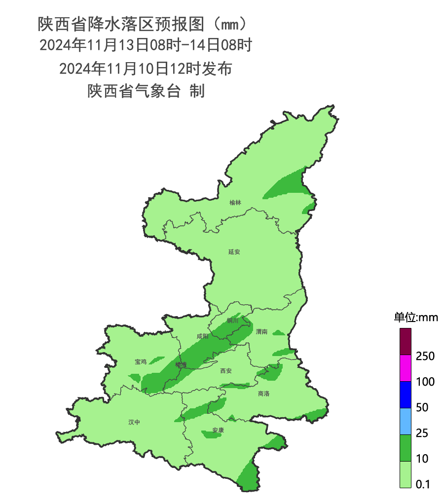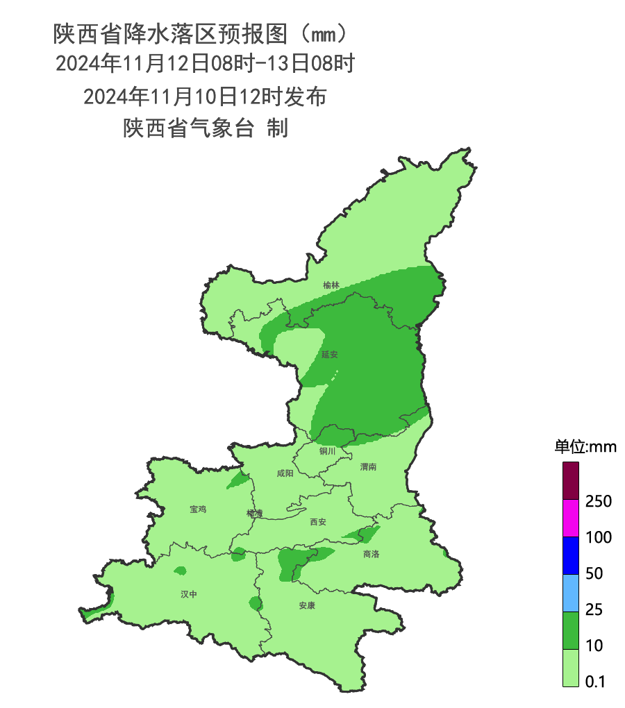 11-13日降水主要時段在12日到13日白天,其中12日(圖1),全省大部有小雨(0.1-10mm),陝北南部、秦嶺山區局地有中雨(10-25mm)。