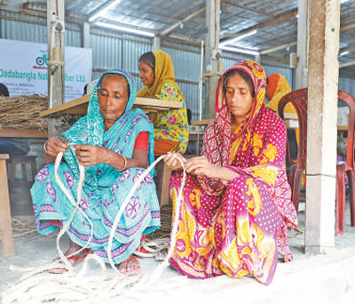 在孟加拉國達達公司工坊,當地婦女在製作黃麻手工藝品。本報記者 劉 慧攝