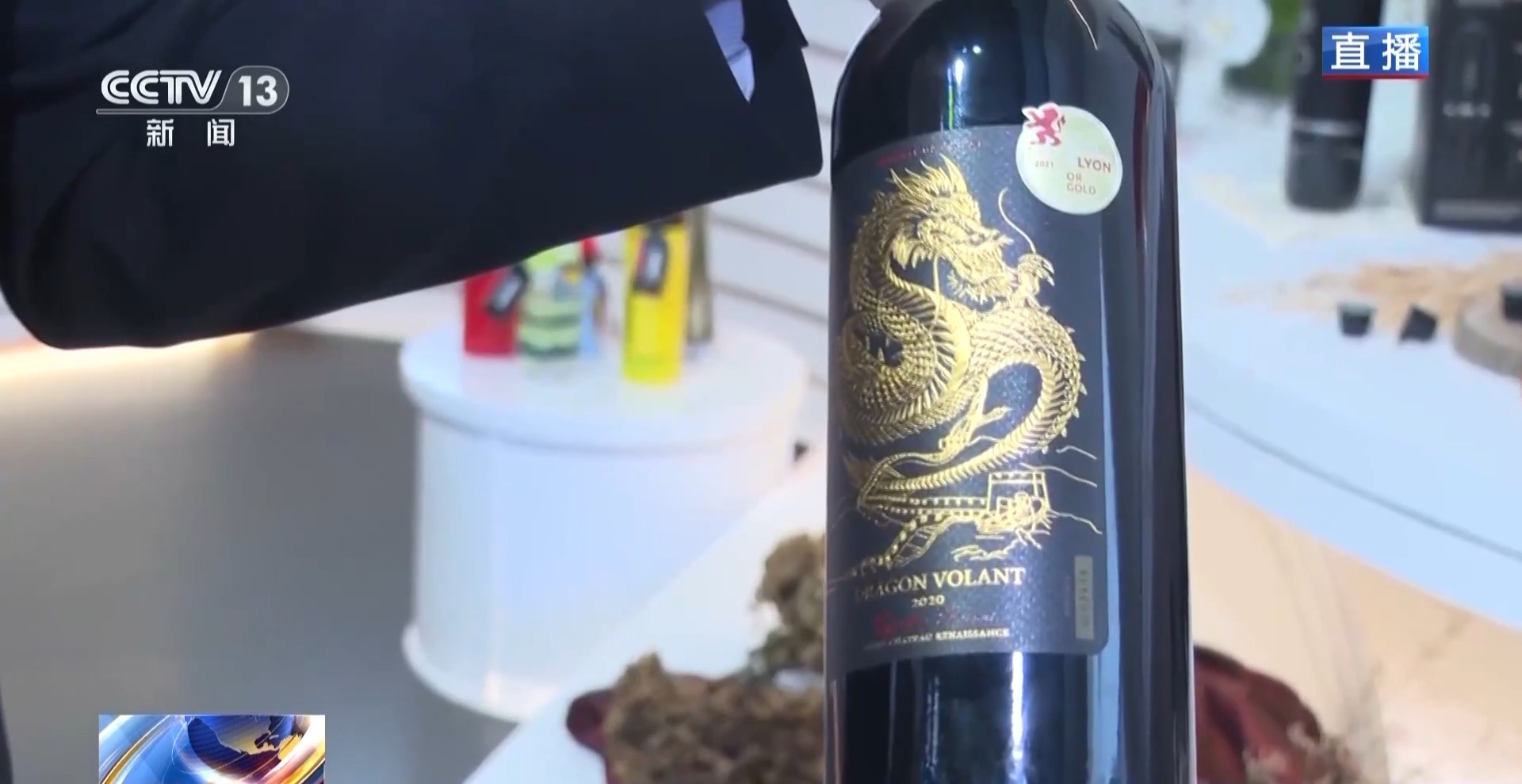 要特別介紹的是一款乾紅葡萄酒。這款葡萄酒,酒瓶裏面,是來自法國波爾多一家葡萄酒莊園陳釀18個月的美酒;而酒瓶外面,也是一個亮點,是由中國和法國設計師聯合設計的極具中國文化特色的金龍和長城圖案包裝,這不僅是一瓶佳釀,更是中法文化交流、友好往來的見證。