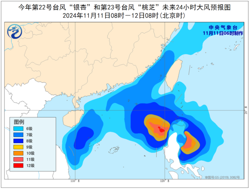 預計,11日08時至12日08時,受颱風“銀杏”、“桃芝”及冷空氣的共同影響,台灣海峽、南海北部和中部、巴士海峽、西沙羣島、東沙羣島、海南島東部沿海、台灣島西部和東南部沿海、福建沿海、廣東東部沿海將有6-8級、陣風9-10級的大風,其中南海中東部的部分海域風力可達9-10級、陣風11-12級,“桃芝”中心經過的附近海域和地區風力可達11-12級,陣風13-14級(見圖3)。中央氣象台11月11日06時發佈颱風藍色預警。