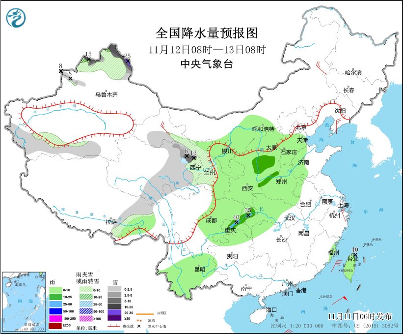 *11月12日08時至13日08時,*新疆北疆北部和南疆南部山區、西藏東北部、青海東部和南部、甘肅河西和中南部等地部分地區有小到中雪或雨夾雪,其中,新疆阿勒泰北部、塔城北部和伊犁河谷北部山區、青海東部等地部分地區有大到暴雪,局地大暴雪(20~25毫米)。內蒙古中部、寧夏、甘肅東部、陝西、山西、河北中南部、天津、河南、山東西部、湖北中西部、四川盆地、重慶、貴州北部、雲南中南部、西藏東南部、福建東部、台灣島等地部分地區有小到中雨,其中,重慶中西部和東北部、台灣島北部等地部分地區有大雨(25~40毫米)。內蒙古東北部、遼東半島、甘肅河西、浙江北部等地部分地區有4~5級風(見圖5)。