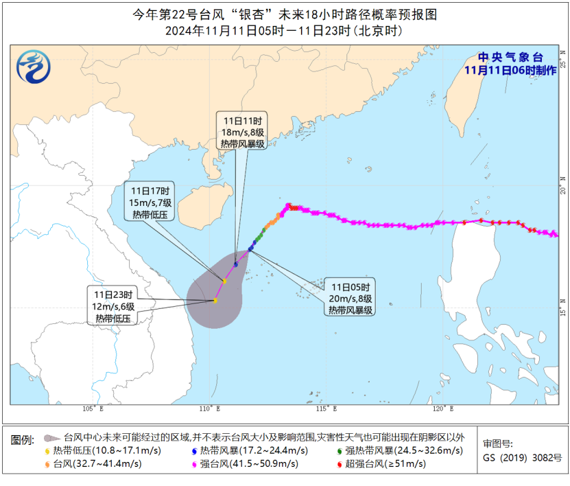 圖1 今年第22號颱風“銀杏”未來18小時路徑概率預報圖(11日05時-11日23時)