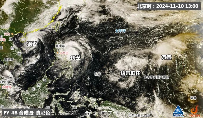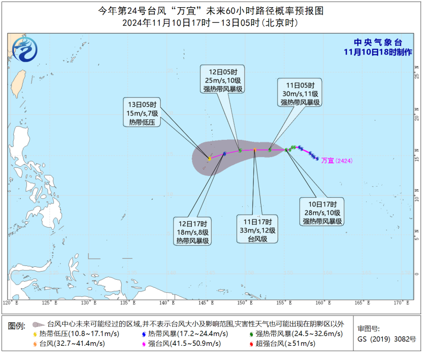 今年第24號颱風“萬宜”(強熱帶風暴級)的中心10日17時位於美國關島東偏北方向約1150公里的洋麪上,即北緯15.7度、東經155.2度,中心附近最大風力10級(28米/秒),中心最低氣壓982百帕,七級風圈半徑50—100公里,十級風圈半徑10—30公里。