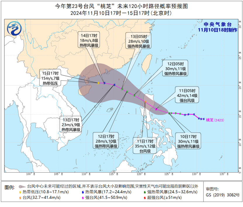 今年第23號颱風“桃芝”(強熱帶風暴級)10日15時其中心位於菲律賓馬尼拉偏東方向約435公里的洋麪上,即北緯15.2度、東經125.0度,中心附近最大風力11級(30米/秒),中心最低氣壓980百帕,七級風圈半徑130—280公里,十級風圈半徑10—50公里。
