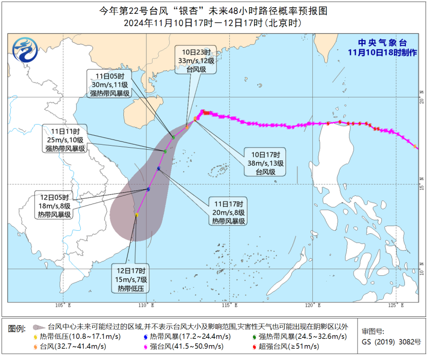 預計,“銀杏”將以每小時5—10公里的速度向西南方向移動,強度逐漸減弱,並趨向于越南南部沿海。