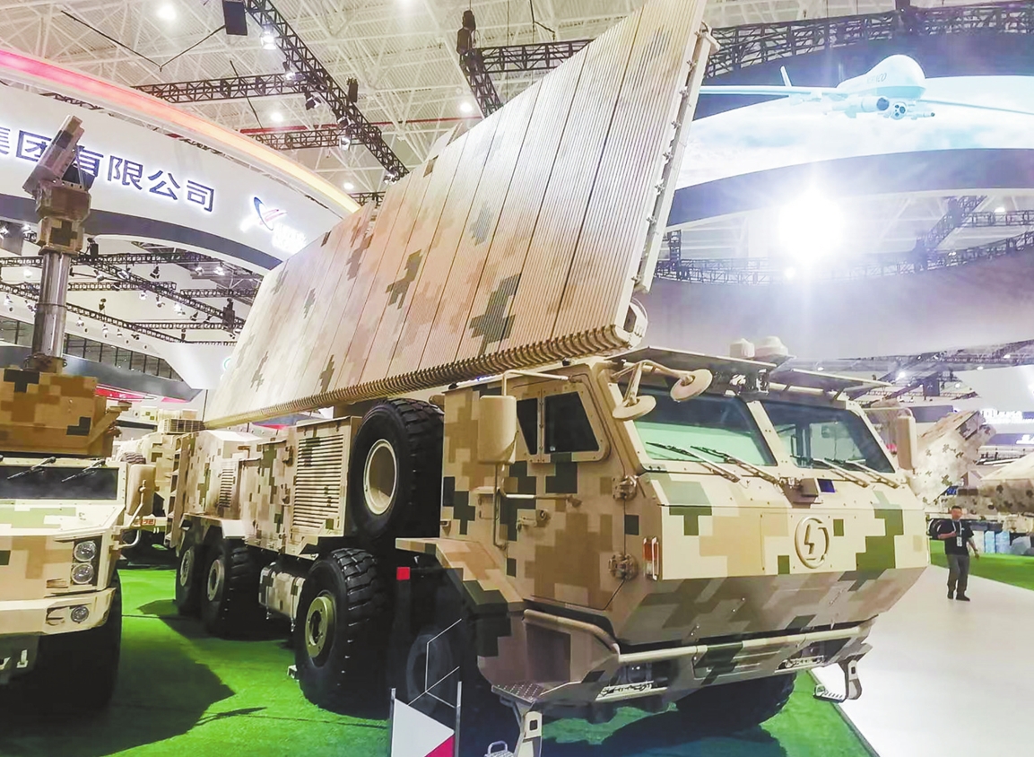 《環球時報》記者剛踏入中國兵器館,就看到入門處左右兩邊的高功率微波武器與VT4A主戰坦克、VT5U輕型無人化坦克,它們分別代表了這兩大類武器的趨勢——無人機對抗與無人機配合。小型無人機是典型的“低慢小”目標,尤其是面對現代戰爭中數量越來越多的小型自殺無人機集羣攻擊,傳統防禦手段的壓力也越來越大。而作為新型定向能武器,高功率微波武器結合了點殺傷與面殺傷的能力,通過向指定方向釋放特定頻率的高能電磁波,燒燬無人機內部的電子元器件,從而達到消除無人機威脅的效果。據介紹,這次中國兵器館出現的兩款高功率微波武器均具備獨立作戰能力,它們分別裝在不同底盤上,其中輪式戰車底盤越野能力更好,適合為機械化部隊提供伴隨式野戰防空掩護;而重型卡車底盤攜帶的微波武器功率體積更大,適合執行要地防禦等任務。