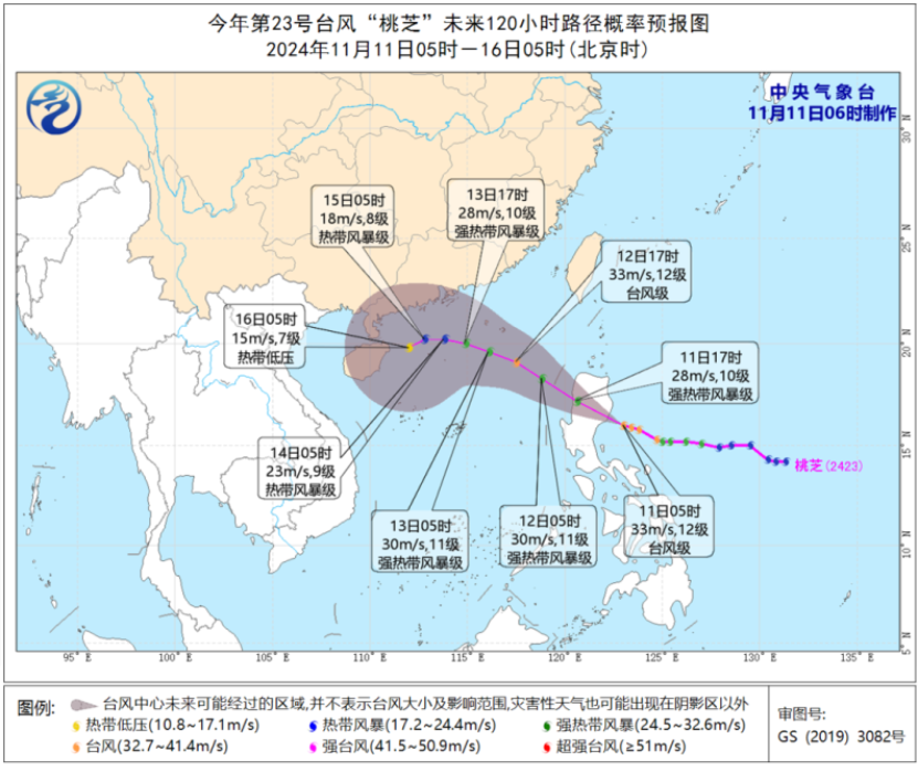 預計,11日08時至12日08時,受颱風“銀杏”、“桃芝”及冷空氣的共同影響,台灣海峽、南海北部和中部、巴士海峽、西沙羣島、東沙羣島、海南島東部沿海、台灣島西部和東南部沿海、福建沿海、廣東東部沿海將有6至8級、陣風9至10級的大風,其中南海中東部的部分海域風力可達9至10級、陣風11至12級,“桃芝”中心經過的附近海域和地區風力可達11至12級,陣風13至14級。中央氣象台11月11日06時發佈颱風藍色預警。