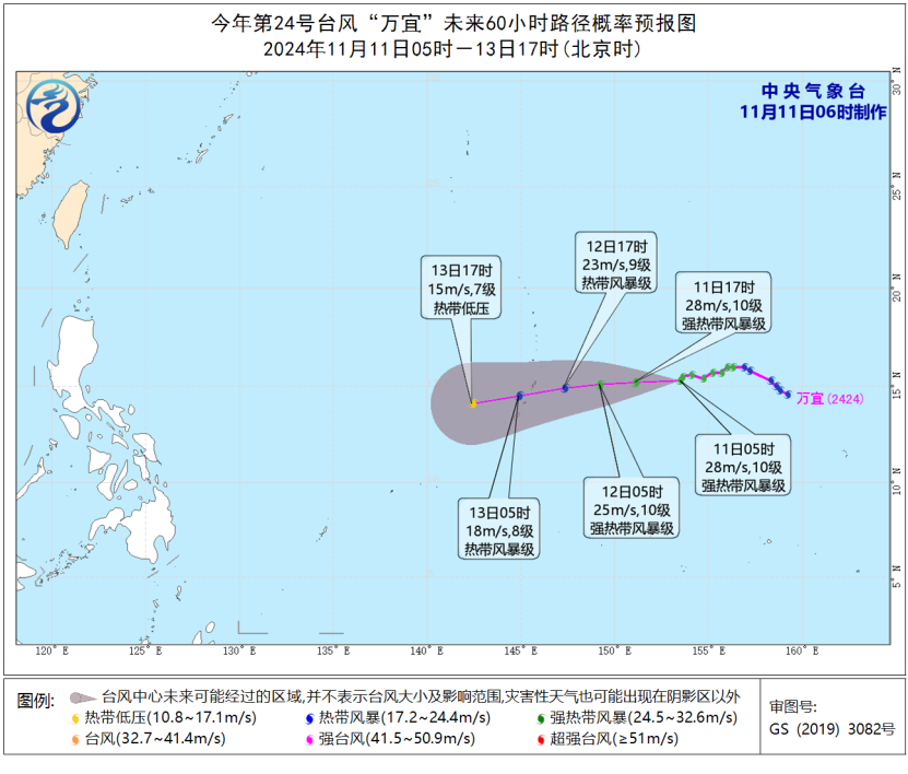 此外,今年第24號颱風“萬宜”(強熱帶風暴級)的中心今天早晨5點鐘位於美國關島東偏北方向約960公里的洋麪上,就是北緯15.3度、東經153.5度,中心附近最大風力10級(28米/秒),中心最低氣壓982百帕,七級風圈半徑80至120公里,十級風圈半徑20至30公里。