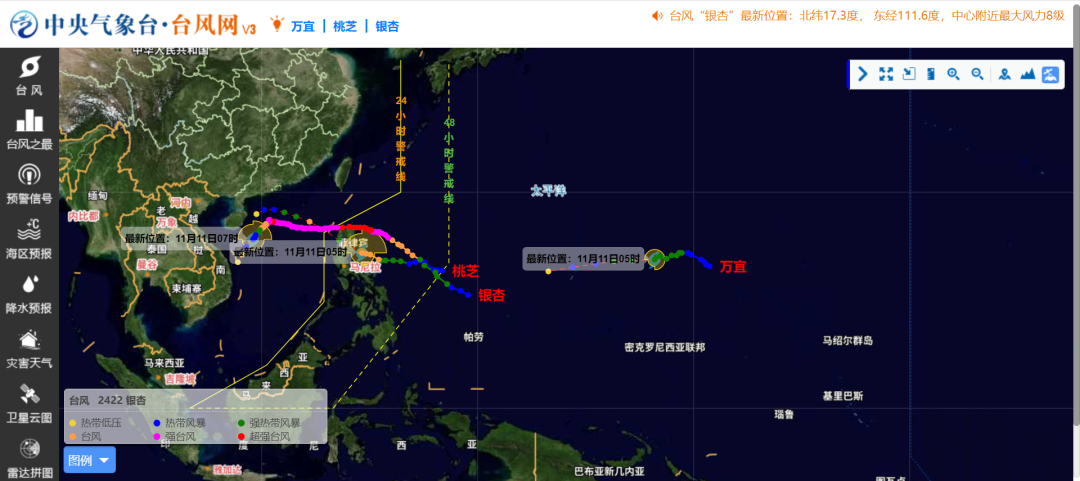 颱風“銀杏”減弱為熱帶風暴級 “桃芝”加強為颱風級 “萬宜”繼續向偏西方向移動