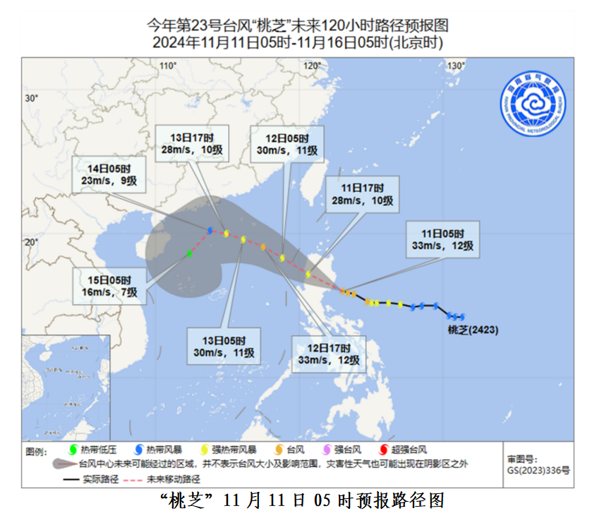 今年第23號颱風“桃芝”已於10日夜間由強熱帶風暴級加強為颱風級,11日05時其中心位於北緯16.0度、東經123.0度,也就是在距離菲律賓馬尼拉東北方向約265公里的洋麪上,中心附近最大風力12級(33米/秒)。預計,“桃芝”將以每小時25公里左右的速度向西偏北方向移動,將於11日白天在菲律賓呂宋島東部沿海登陸(颱風級或強颱風級,12~14級,35~42米/秒),穿過呂宋島後於12日移入南海東部海面,強度緩慢減弱,並逐漸趨向海南島東部到廣東西部一帶海面。