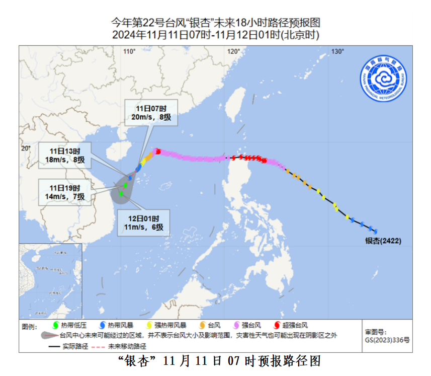 今年第22號颱風“銀杏”已於昨天(10日)夜間由颱風級減弱為強熱帶風暴級,今天(11日)凌晨繼續減弱為熱帶風暴級。11日07時其中心位於北緯17.3度、東經111.6度,也就是在距離海南省三沙市永興島西偏北方向約95公里的海面上,中心附近最大風力8級(20米/秒),七級風圈半徑120~200公里。預計,“銀杏”將以每小時15~20公里的速度繼續向西南方向移動,將於今天白天穿過西沙羣島一帶海面,強度逐漸減弱,並趨向于越南南部沿海。