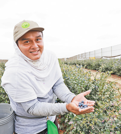 在秘魯特魯希略市一家農場裏,一名採摘工人在展示他剛摘下的藍莓。