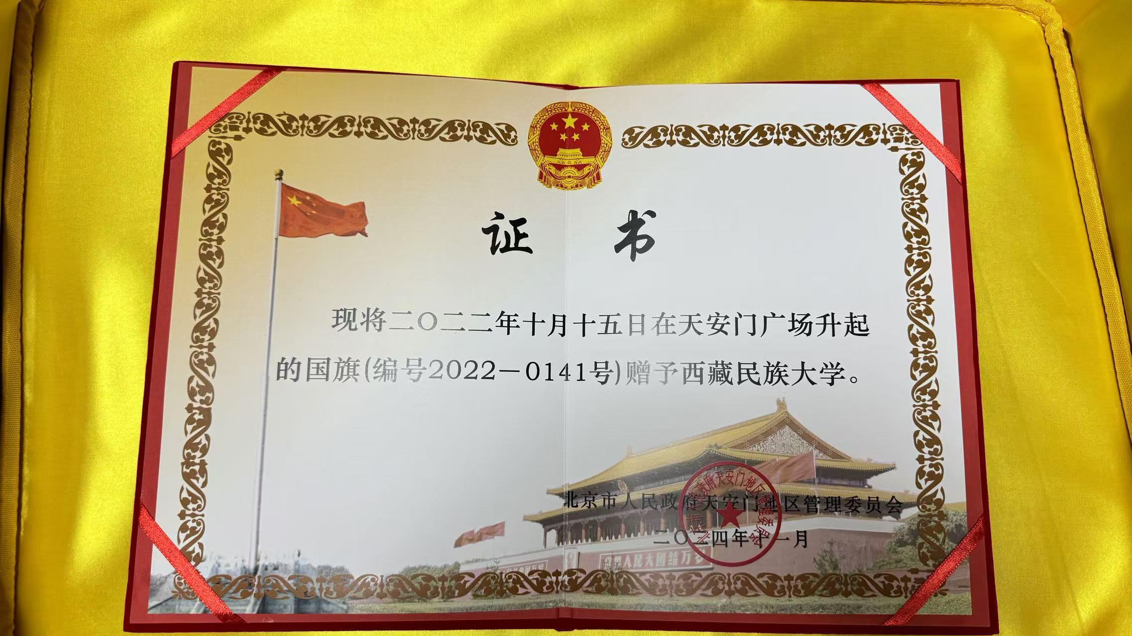 11月8日,北京市人民政府天安門地區管理委員會向西藏民族大學贈送編號(2022—0141)天安門廣場國旗。