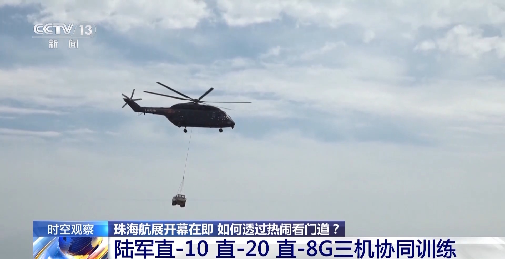 在珠海金灣機場,飛行員們分別駕駛直-10、直-20、直-8G三種機型,依次升空,迅速完成編隊。三機協同,以楔形編隊完成通場飛行。