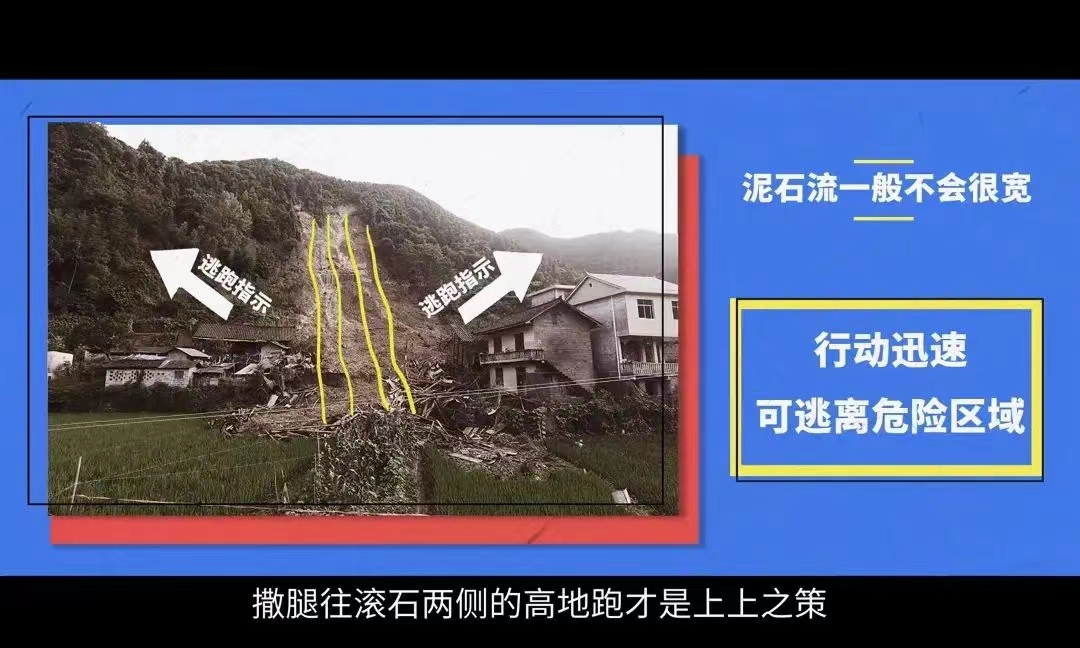 2. 如果遭遇泥石流等地質災害,迅速轉移到安全的高地,不要在低窪處或山坡下躲避,不要順溪溝方向往上游或下游跑,要向與山洪、泥石流方向垂直的兩側山坡上爬。