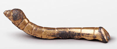 鎏金銅蠶。1984年出土於陝西安康石泉縣,體態為蠶仰頭或吐絲狀,製作精緻,造型逼真,見證了開闢絲綢之路的歷史。