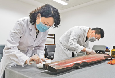 遼寧省博物館工作人員在對九霄環佩琴進行保養。九霄環佩琴製作於唐代。在古琴琴底,鐫刻着“九霄環佩”四個字。琴面上,鑲嵌着13個由蚌殼製成的圓點,起到標記琴絃音位的作用。