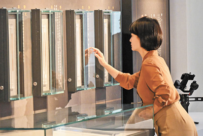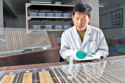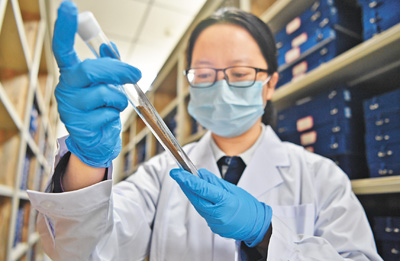 甘肅簡牘博物館的工作人員在文物庫房內查看簡牘保存情況。