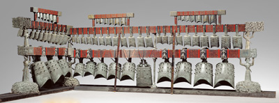 曾侯乙編鐘。1978年出土於湖北隨縣(今隨州市)曾侯乙墓,戰國時期青銅樂器的巔峯之作,編鐘的鐘體、鍾架和掛鐘構件上共有3755字銘文,包含了豐富的樂律學知識。