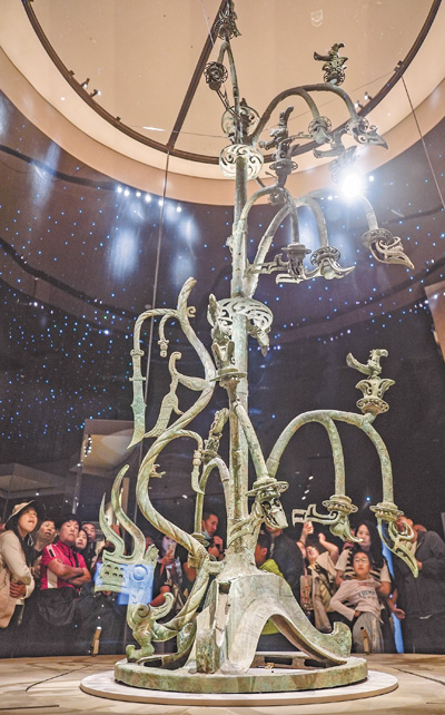 四川廣漢三星堆博物館內,觀眾圍在Ⅰ號大型銅神樹前仔細觀看。Ⅰ號大型銅神樹由底座、樹和龍三部分組成,體現了高超的冶鑄技術和藝術水平。
