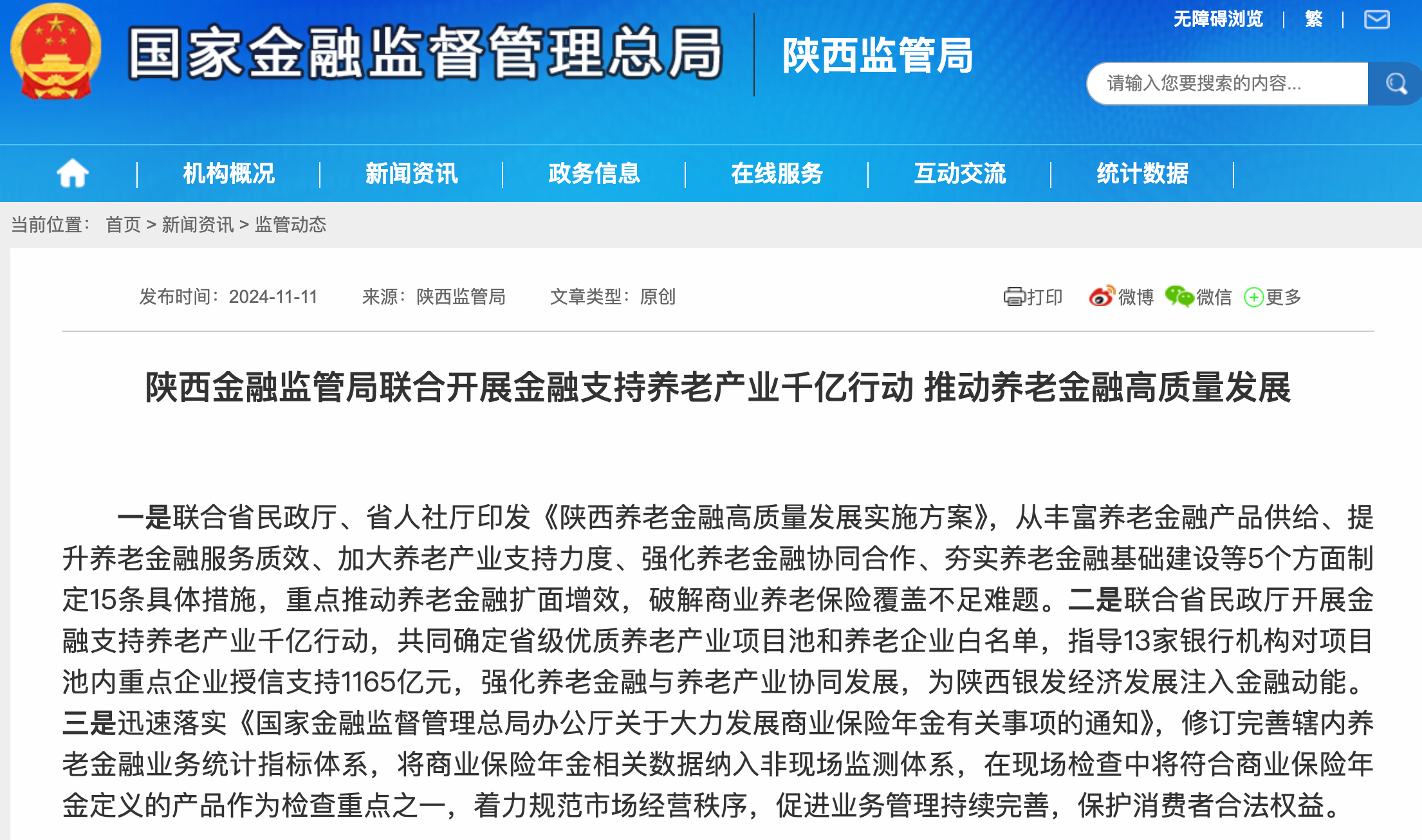 具體提到三項內容。一是聯合陝西省民政廳、省人社廳印發《陝西養老金融高質量發展實施方案》,從豐富養老金融產品供給、提升養老金融服務質效、加大養老產業支持力度、強化養老金融協同合作、夯實養老金融基礎建設等5個方面制定15條具體措施,重點推動養老金融擴面增效,破解商業養老保險覆蓋不足難題。