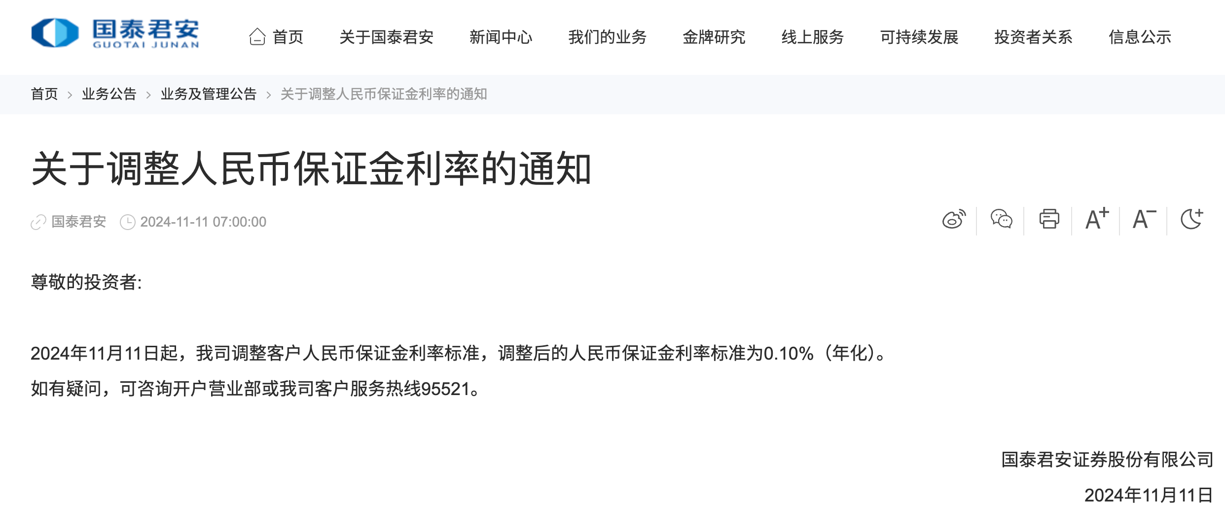同時,海通證券也發佈公告稱,11月11日起,公司調整客户人民幣保證金利率標準,調整後的人民幣保證金利率標準為0.10%(年化利率)。