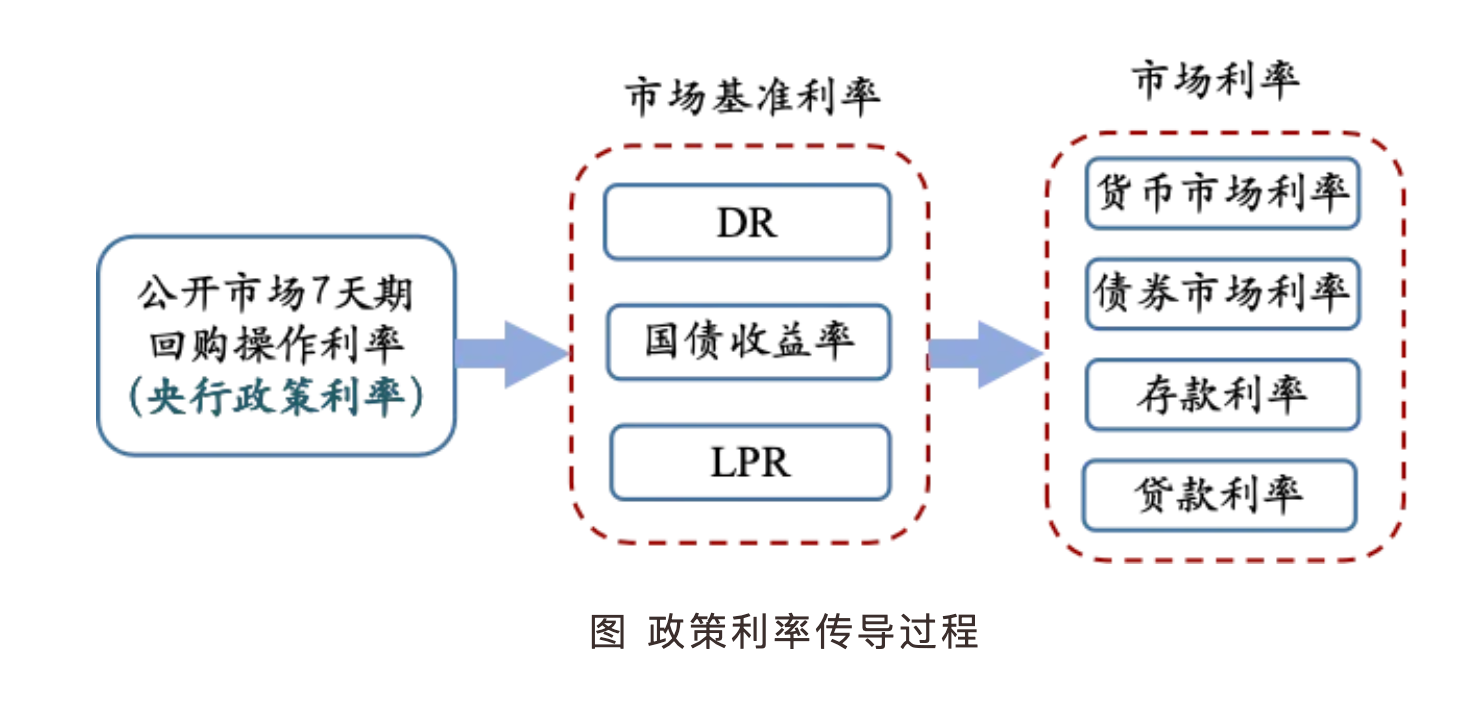 人民銀行通過調整政策利率,也就是7天期回購操作利率,影響貨幣市場利率(如同業存單利率)和債券市場利率(如國債收益率),並影響存貸款利率(如貸款市場報價利率(LPR)和銀行存款掛牌利率),進而促進消費和投資,提升社會總需求,支持經濟發展。
