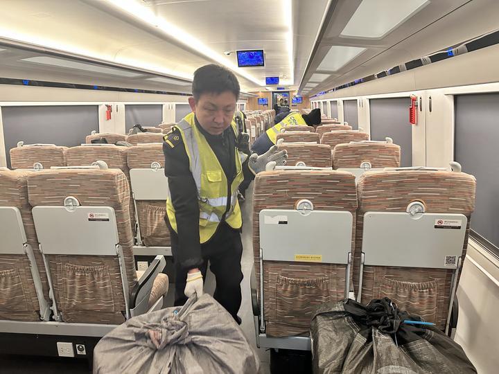 中鐵快運工作人員在高鐵上搬運快遞。(受訪者供圖)