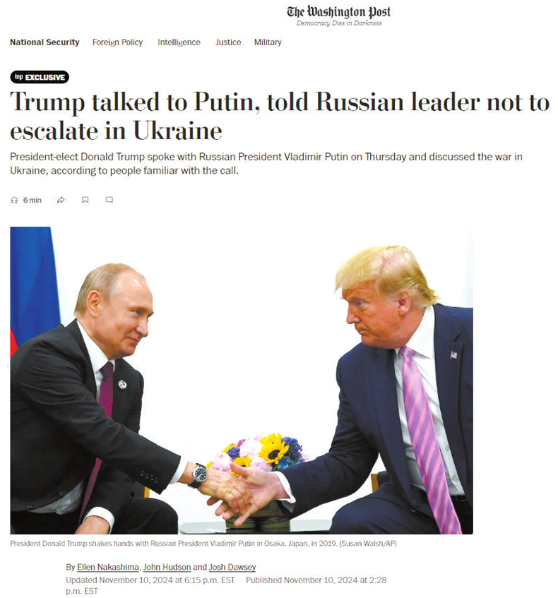 【環球時報駐俄羅斯特約記者 李黎 環球時報特約記者 柳玉鵬 甄翔】“特朗普與普京對話,告訴俄羅斯領導人不要升級烏克蘭局勢。”美國《華盛頓郵報》網站10日刊登的“獨家報道”在國際輿論場引發強烈關注。這篇報道援引知情人士的話説,特朗普上週四與普京通話,談到了在歐洲大陸上實現和平的目標,這名美國當選總統還表達了與普京進行後續對話的興趣,以討論“儘快解決烏克蘭戰爭”。不過到11日下午,俄羅斯總統新聞秘書佩斯科夫就進行了闢謠。據俄衞星通訊社報道,佩斯科夫表示相關消息“完全與事實不符”。有分析人士認為,《華盛頓郵報》發佈“假消息”可能是為了試探國際社會的反應。也有俄學者稱,特朗普一定會恢復與普京的直接對話。