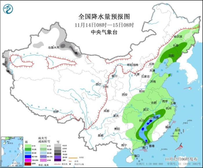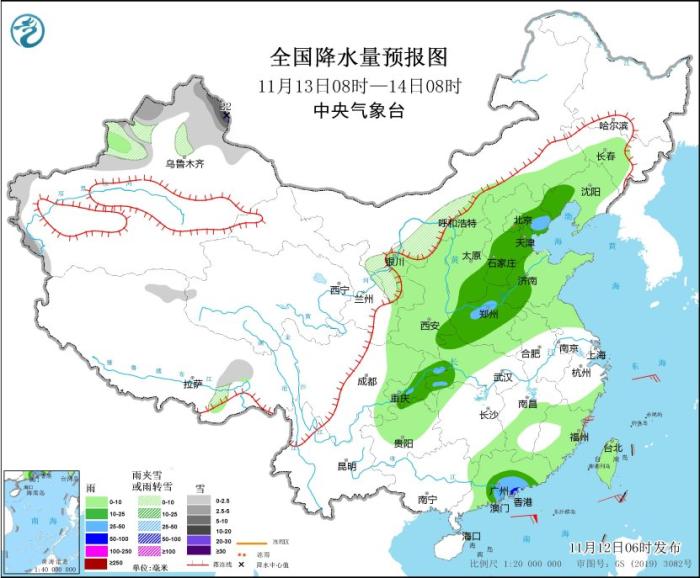 11月13日08時至14日08時,內蒙古河套地區、新疆北疆北部和北疆東部、西藏東部和北部、寧夏中北部、陝西北部等地部分地區有小到中雪或雨夾雪,其中,新疆北疆東部等地部分地區有大到暴雪,局地大暴雪(20~22毫米)。遼寧西部、華北中北部和南部、黃淮東部和西部、重慶中部、華南南部等地部分地區有中到大雨,其中,廣東東南部沿海等地部分地區有暴雨。