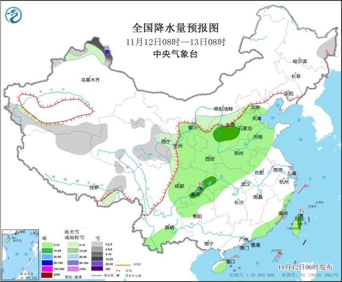 11月12日08時至13日08時,內蒙古河套地區、黑龍江東北部、新疆北疆北部和南疆盆地、西藏東部、青海東部和南部、甘肅南部、寧夏北部、陝西北部、山西北部、川西高原北部等地部分地區有小到中雪或雨夾雪,其中,新疆北疆北部和北疆東部等地部分地區有大到暴雪,局地大暴雪(20~28毫米)。西北地區東部、華北大部、黃淮、江淮西部、江漢大部、西南地區東部、雲南西南部、廣東東南部、海南島、台灣島等地部分地區有小到中雨,其中,湖北南部、重慶中西部和東北部、台灣島北部和東部等地部分地區有大雨(25~45毫米)。黑龍江東北部、福建東南部等地部分地區有4~6級風。