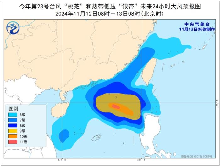 12日08時至13日08時,受颱風“銀杏”、“桃芝”及冷空氣的共同影響,東海西南部、台灣海峽、巴士海峽、南海北部和中部、西沙羣島、東沙羣島、海南島東部和南部沿海、廣東沿海、福建沿海、台灣島西部沿海將有6-8級,陣風9-10級的大風,“桃芝”中心經過的附近海域和地區風力可達9-11級,陣風12-13級。中央氣象台11月12日06時繼續發佈颱風藍色預警。