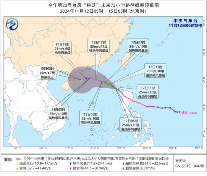 第23號颱風“桃芝”未來72小時路徑概率預報圖(12日05時-15日05時)圖片來源:中央氣象台網站