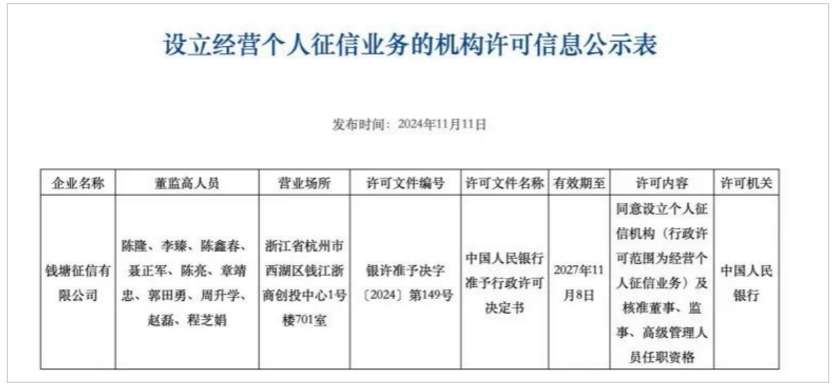中國個人徵信市場迎來新成員,錢塘徵信獲頒牌照