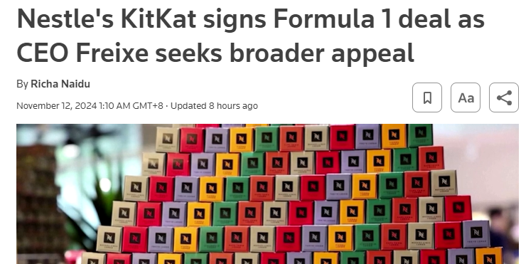 【環球網財經綜合報道】11月12日,據路透社消息,近日,雀巢旗下知名巧克力品牌KitKat宣佈與一級方程式賽車(F1)簽署了一項全球贊助協議,標誌着這家全球最大食品公司在營銷策略上的重大轉變。新任首席執行官Laurent Freixe正積極推動這一變革,旨在通過新的營銷方式提升KitKat的全球影響力和對年輕消費者的吸引力。