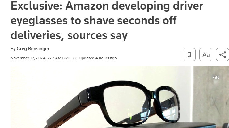 【環球網科技綜合報道】11月12日消息,據路透社消息,亞馬遜正在為送貨司機研發一款智能眼鏡,以在建築物內、周圍及內部進行精準導航,從而確保訂單能夠更快、更準確地送達客户手中。