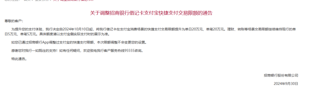 9月30日,招商銀行在官網發文稱,自10月10日起,將該行借記卡在支付寶消費場景的快捷支付交易限額提升為單日20萬元、單筆20萬元。理財、轉賬等場景交易限額繼續維持現行的單日5萬元、單筆5萬元。