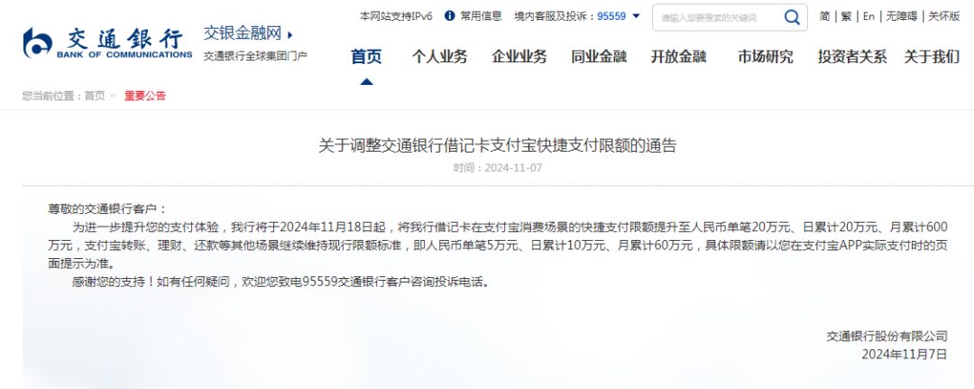 日前,交通銀行發佈公告稱,將於11月18日起,將該行借記卡在支付寶消費場景的快捷支付限額提升至單筆20萬元、日累計20萬元、月累計600萬元,支付寶轉賬、理財、還款等其他場景繼續維持現行限額標準,即單筆5萬元、日累計10萬元、月累計60萬元。