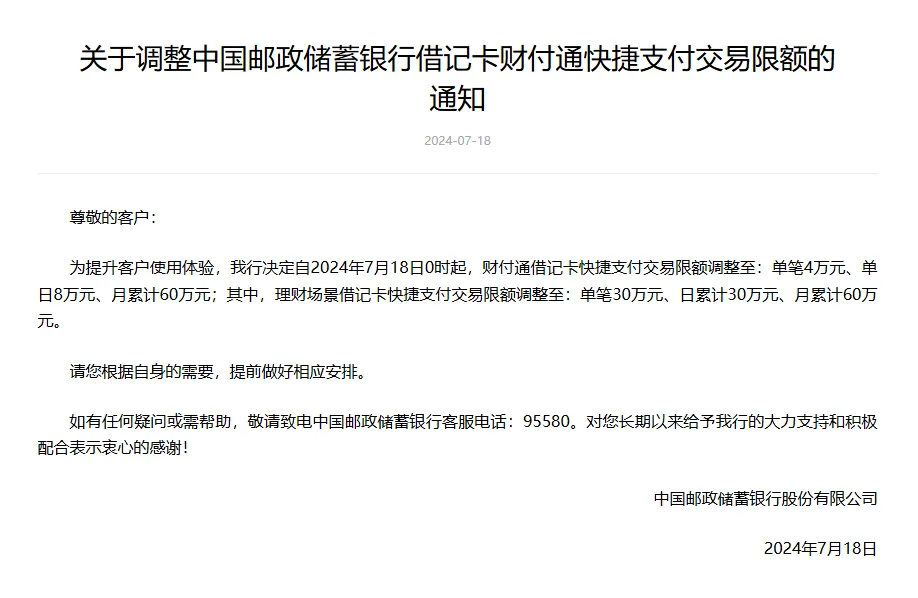 7月18日,郵儲銀行發佈《關於調整中國郵政儲蓄銀行借記卡財付通快捷支付交易限額的通知》,決定自7月18日起,財付通借記卡快捷支付交易限額調整至:單筆4萬元、單日8萬元、月累計60萬元。其中,理財場景借記卡快捷支付交易限額調整至:單筆30萬元、日累計30萬元、月累計60萬元。