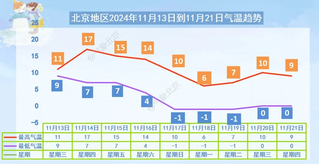 下週北京最高氣温都將在10℃以下。氣象部門建議,初冬時節,氣温波動式走低,提醒您根據天氣變化,及時做好保暖。