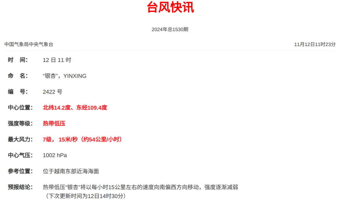 今年第22號颱風“銀杏”11日夜間由熱帶風暴級減弱為熱帶低壓,今日(12日)上午11時其中心位於北緯14.2度、東經109.4度,也就是越南東部近海海面,中心附近最大風力7級(15米/秒)。