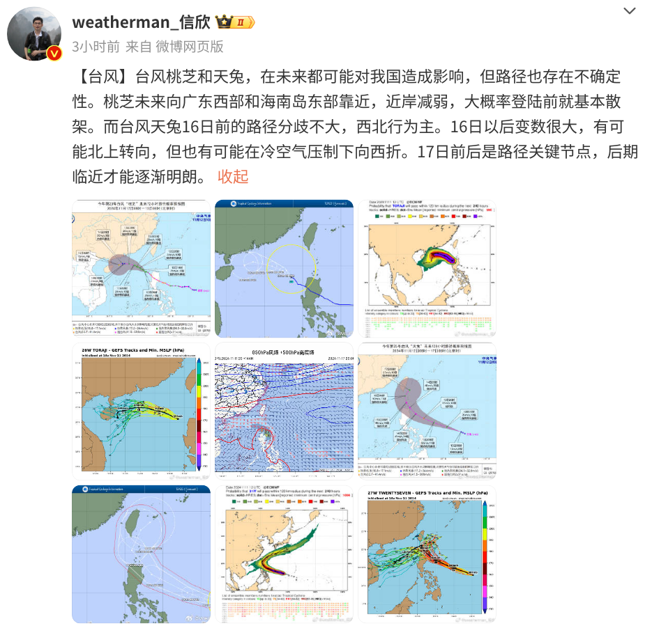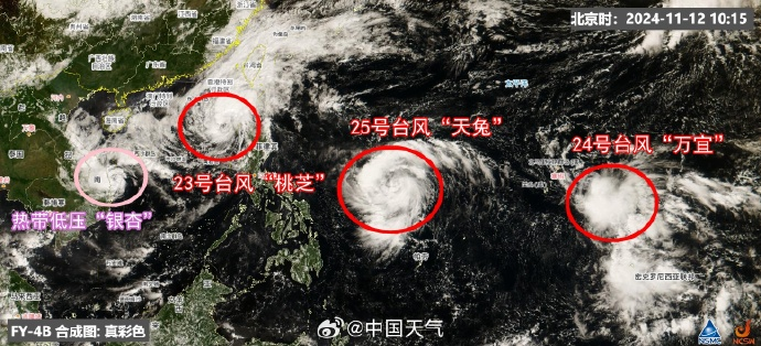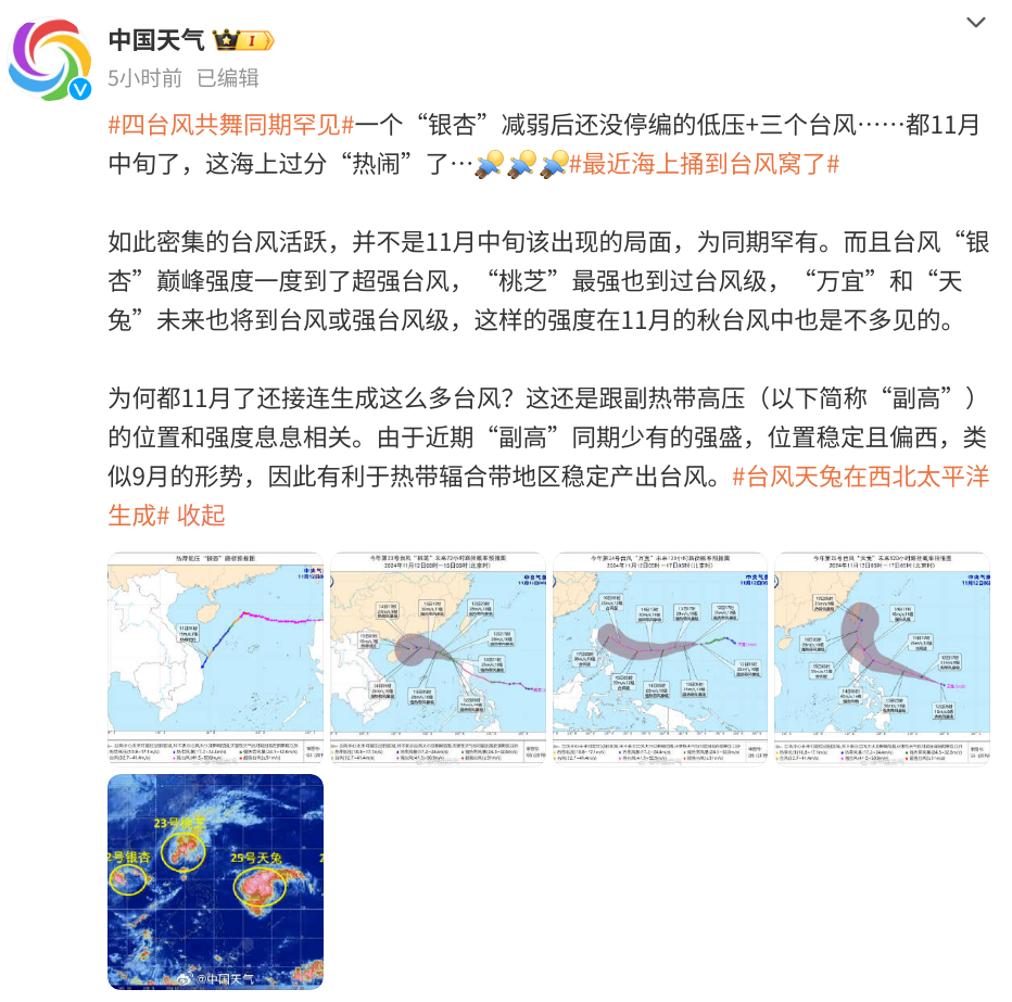 如此密集的颱風活躍,並不是11月中旬該出現的局面,為同期罕有。而且颱風“銀杏”巔峯強度一度到了超強颱風,“桃芝”最強也到過颱風級,“萬宜”和“天兔”未來也將到颱風或強颱風級,這樣的強度在11月的秋颱風中也是不多見的。
