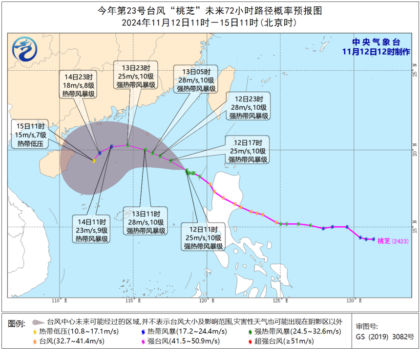 南海北部和中部海面,12日~14日,風力8~10級,其中“桃芝”中心經過的附近海面旋轉風11~12級;中沙和西沙羣島附近海面,陣風8~9級。