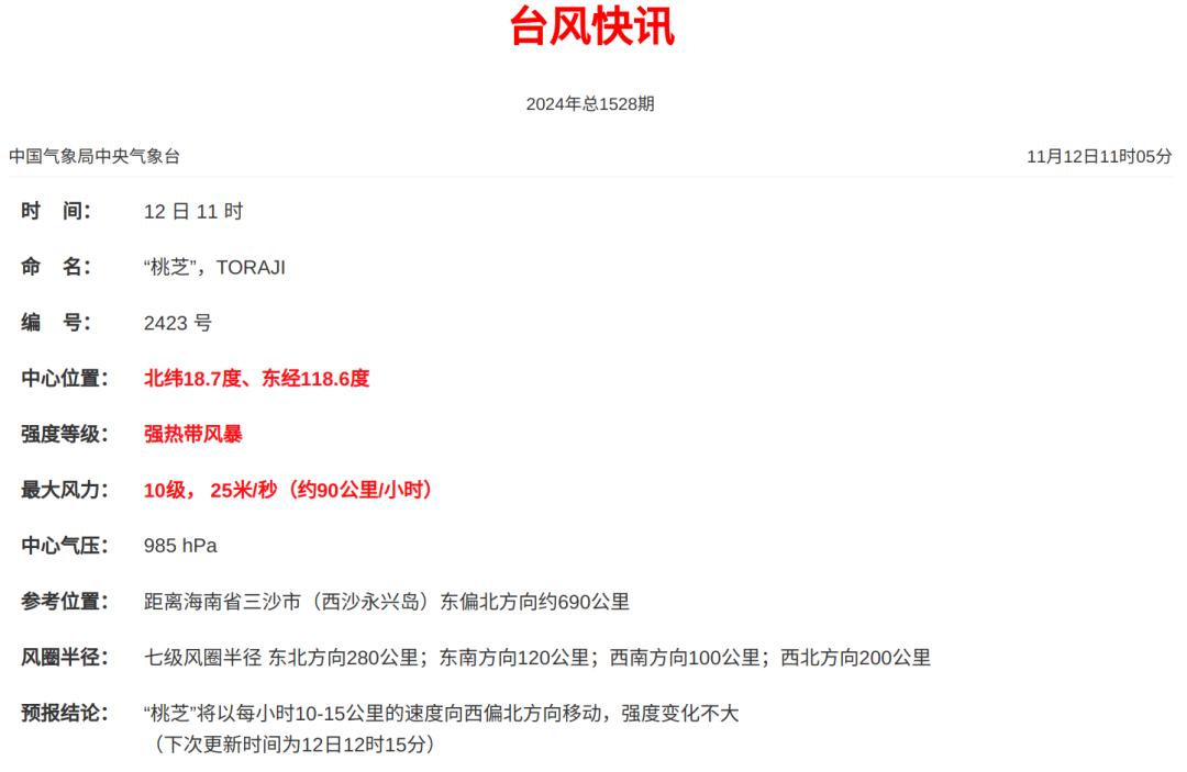 今年第23號颱風“桃芝”已於11日上午在菲律賓奧羅拉省東部沿海登陸,登陸時為颱風級,11日夜間由颱風級減弱為強熱帶風暴級並移入南海東部海面 ,今日(12日)上午11時其中心位於北緯18.7度、東經118.6度,也就是海南省三沙市(西沙永興島)東偏北方向約690公里,中心附近最大風力10級(25米/秒)。