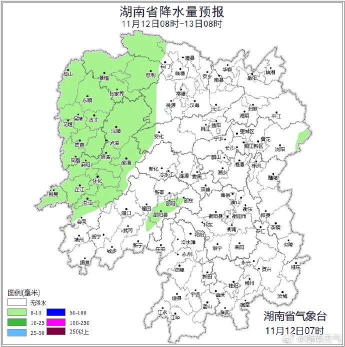 11月13日白天到晚上,湘西北多雲間陰天有陣雨,湘東南多雲轉小雨,其他地區晴天間多雲;北風2~3級;最高氣温湘西北22~24℃,其他地區27~29℃;最低氣温湘西14~16℃,其他地區17~19℃。
