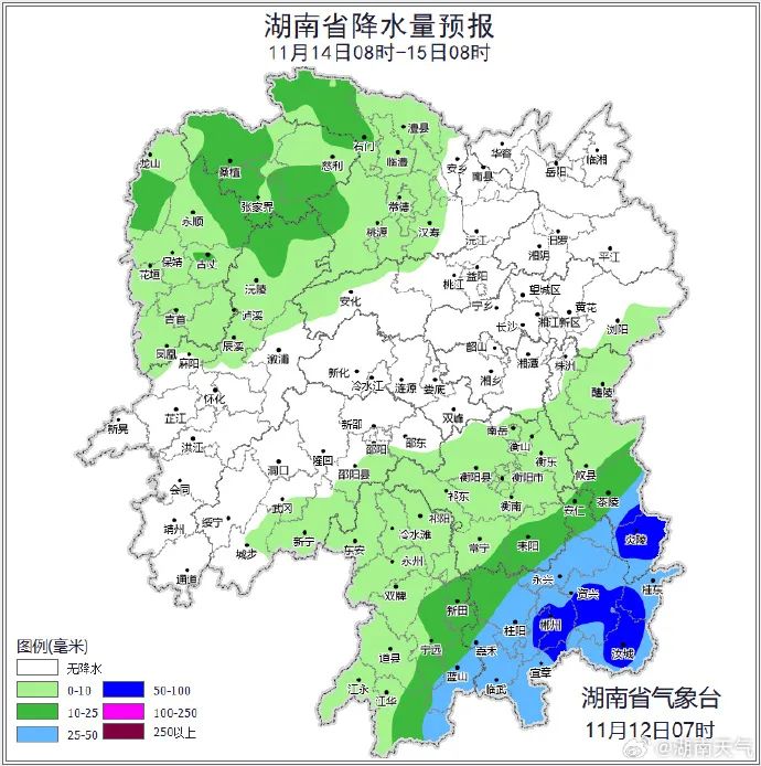 11月14日白天到晚上,湘西北陰天間多雲有小到中雨,湘南多雲轉小到中雨,湘東南部分地區大雨,其中株洲(茶陵、炎陵)、郴州(市區、桂東、汝城、宜章、資興)有暴雨,其他地區晴天間多雲;北風2~3級;最高氣温湘西北22~24℃,其他地區28~30℃;最低氣温湘西15~17℃,其他地區18~20℃。