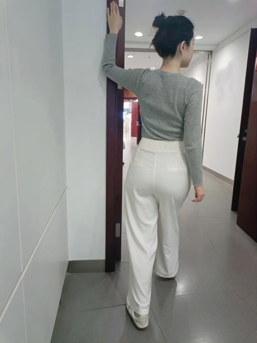 靠近門框站立,將左手肘抬至肩膀高度,肘關節屈曲約90度,手掌貼於門框上;
