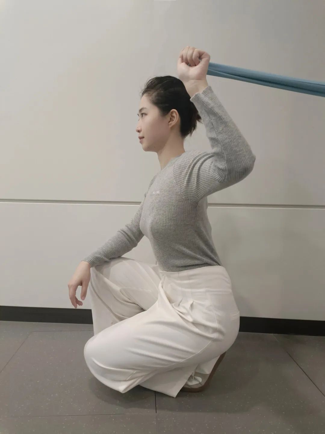 站立或坐姿,彈力帶一端固定在身後的門把手或柱子上,與肩同高,另一端由左手握住;
