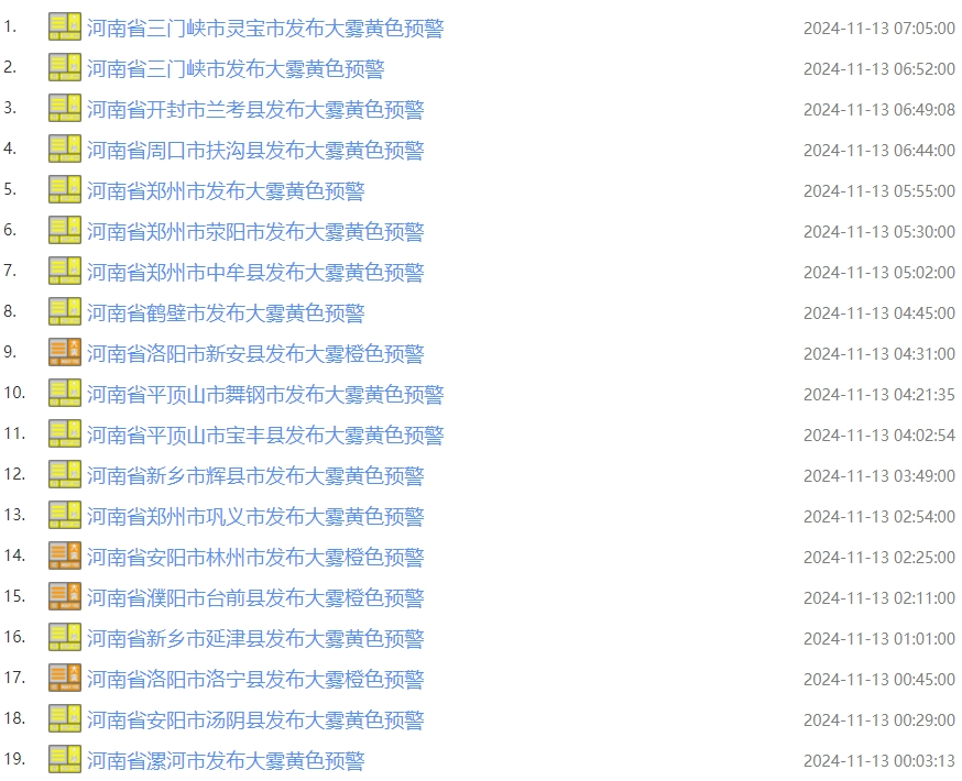此外,今天,河南漯河、三門峽、鶴壁、洛陽、安陽、濮陽、周口、新鄉、滎陽等多地已發佈大霧黃色預警。
