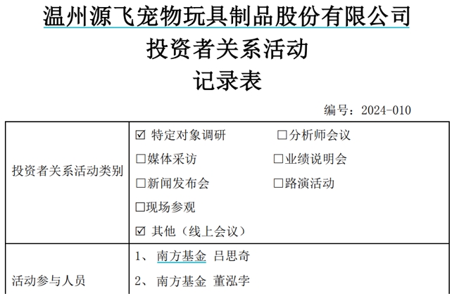 【環球網財經綜合報道】11月13日,上市公司源飛寵物(001222.SZ)發佈了《投資者關係活動記錄表》,披露公司接待了南方基金3位代表的線上會議調研,公司證券事務代表、證券專員參與並解答投資機構代表提問。